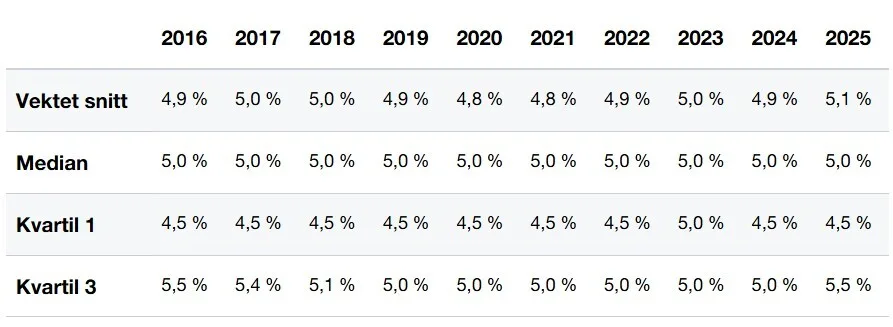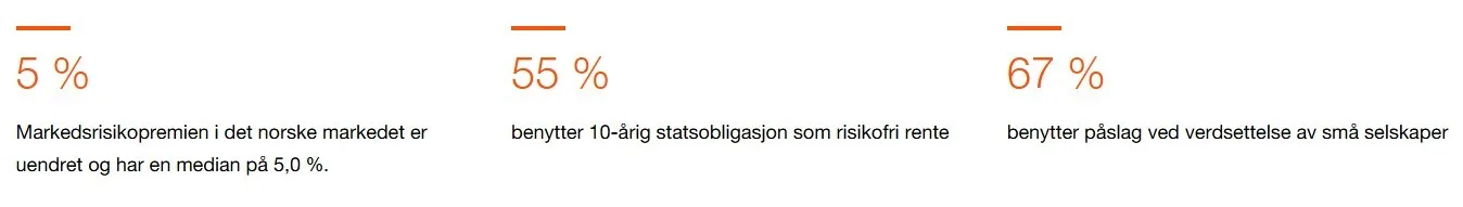 Nivået på markedsrisikopremien i det norske markedet for 2025 ligger på 5,0 %. Størrelsen på markedsrisikopremien har vært stabil i perioden undersøkelsen har vært gjennomført.