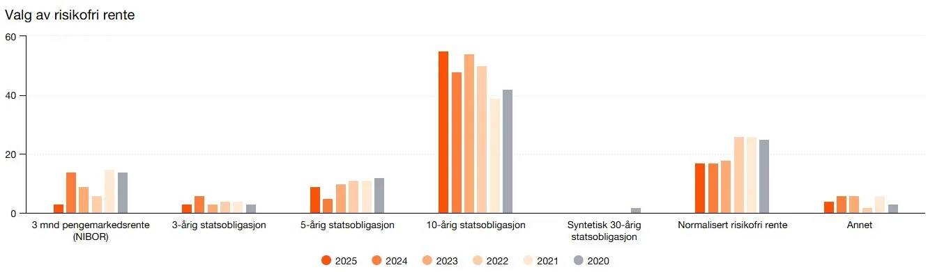 Respondentene ble spurt om hva de benytter som risikofri rente i avkastningskravet til egenkapitalen for norske selskaper. Andelen respondenter som svarer at 10-årig statsobligasjon bør benyttes er 55 % i årets undersøkelse. 17 % svarer at de benytter normalisert risikofri rente.