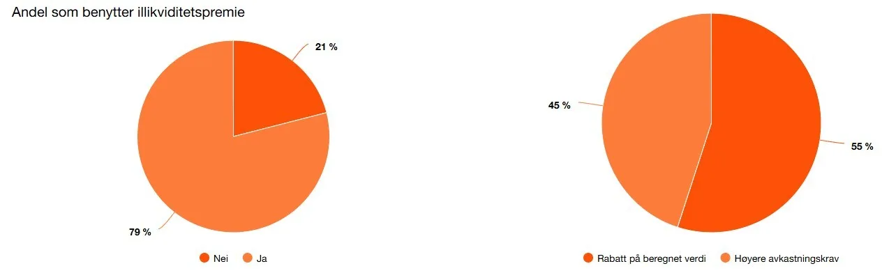Nytt for årets undersøkelse ble respondentene spurt om hvorvidt aksjer som anses som illikvide bør verdsettes med en form for rabatt. 79 % av respondentene oppgir at det bør benyttes en illikviditetsjustering ved verdsettelse av aksjer i unoterte selskaper.