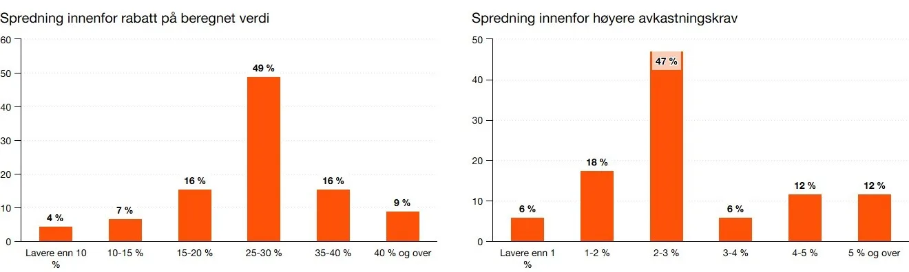 Videre ble respondentene som benytter illikviditetsrabatt bedt om å spesifisere størrelsen på justeringen sammenlignet med antatt fullt likvide, noterte aksjer. Blant de som justerer verdien direkte, oppgir 80 % en rabatt på mellom 15 og 40 %, med en median på 20%. Av respondentene som justerer avkastningskravet, oppgir 65 % et tillegg på 1 - 3 %, med en median på 2,0 %.