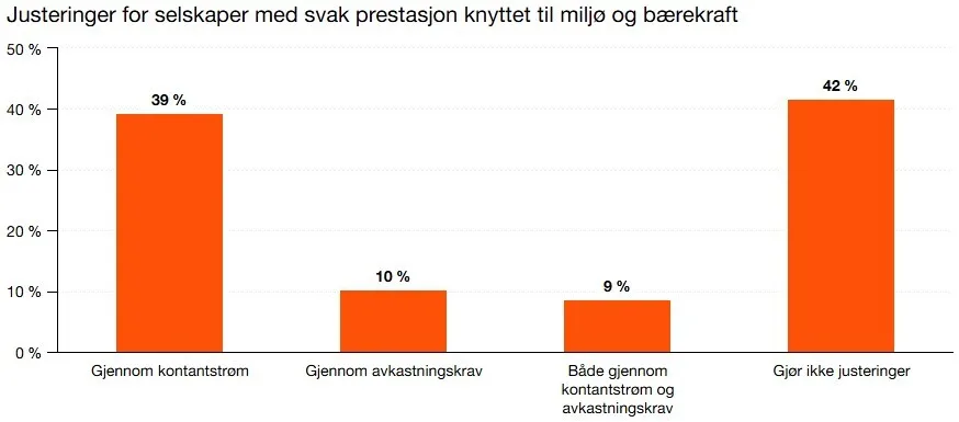 Majoriteten av respondentene justerer kontantstrømmen og/eller avkastningskravet for selskaper med svake prestasjoner tilknyttet miljø og bærekraft (58 %). Dette er en svak økning fra fjoråret, men fortsatt lavere enn nivået tidligere år.