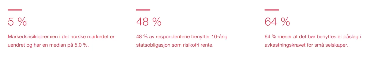Nivået på markedsrisikopremien i det norske markedet for 2024 ligger på 5.0 %. Størrelsen på markedsrisikopremien har vært stabil i perioden undersøkelsen har vært gjennomført og 89% av respondentene oppgir i årets undersøkelse at de ikke har endret benyttet markedsrisikopremie fra i fjor.
