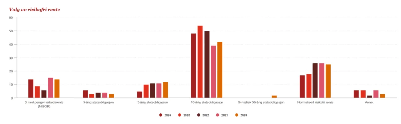 Respondentene ble spurt om hva de benytter som risikofri rente i avkastningskravet til egenkapitalen for norske selskaper. Andelen respondenter som svarer at 10-årig statsobligasjon bør benyttes er 48 % i årets undersøkelse. 17 % svarer at de benytter normalisert risikofri rente.