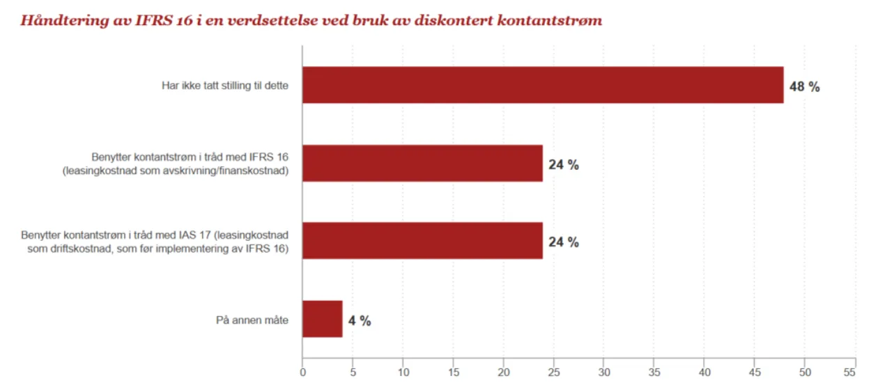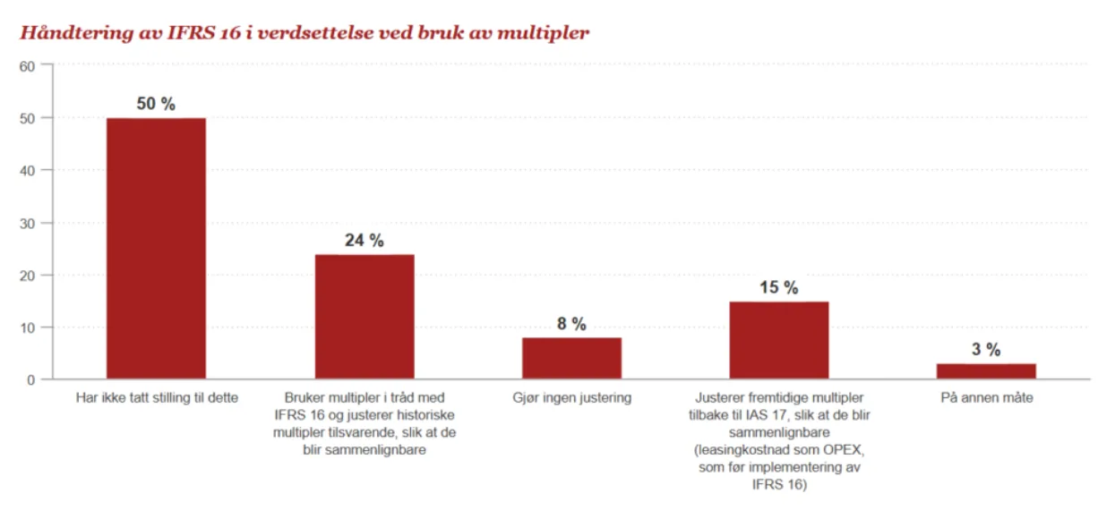 Respondentene ble spurt hvordan de hensyntar IFRS 16 – en ny internasjonal regnskapsstandard innført 1. januar 2019 – i verdsettelsen av et selskap, både når det kommer til kontantstrømanalyse og ved bruk av multipler. Her svarer 24% at de hensyntar dette gjennom å benytte kontantstrøm og multipler i tråd med den nye standarden. Samtidig svarer omtrent halvparten av respondentene at de ikke har tatt stilling til IFRS 16 for noen av metodene.